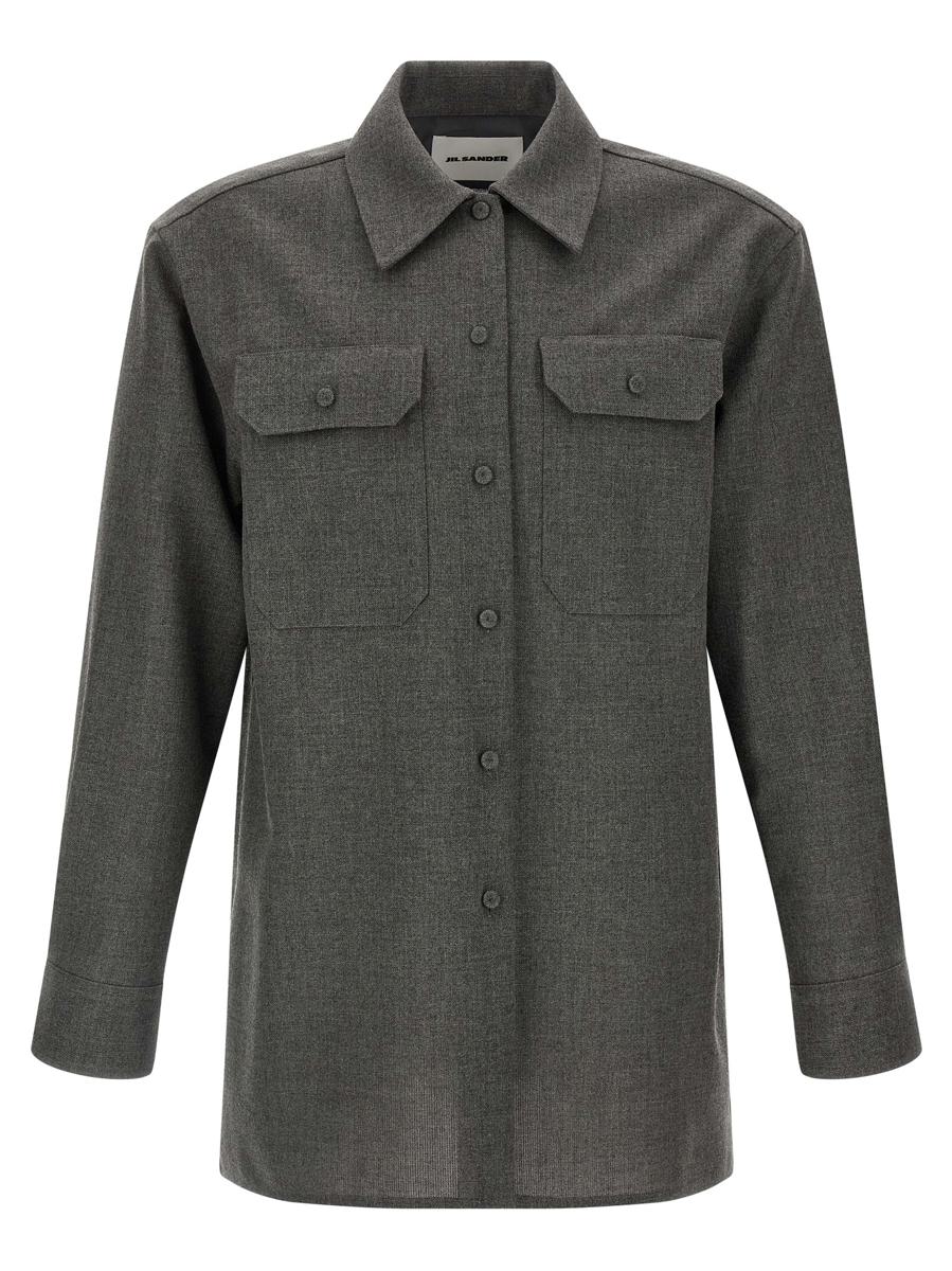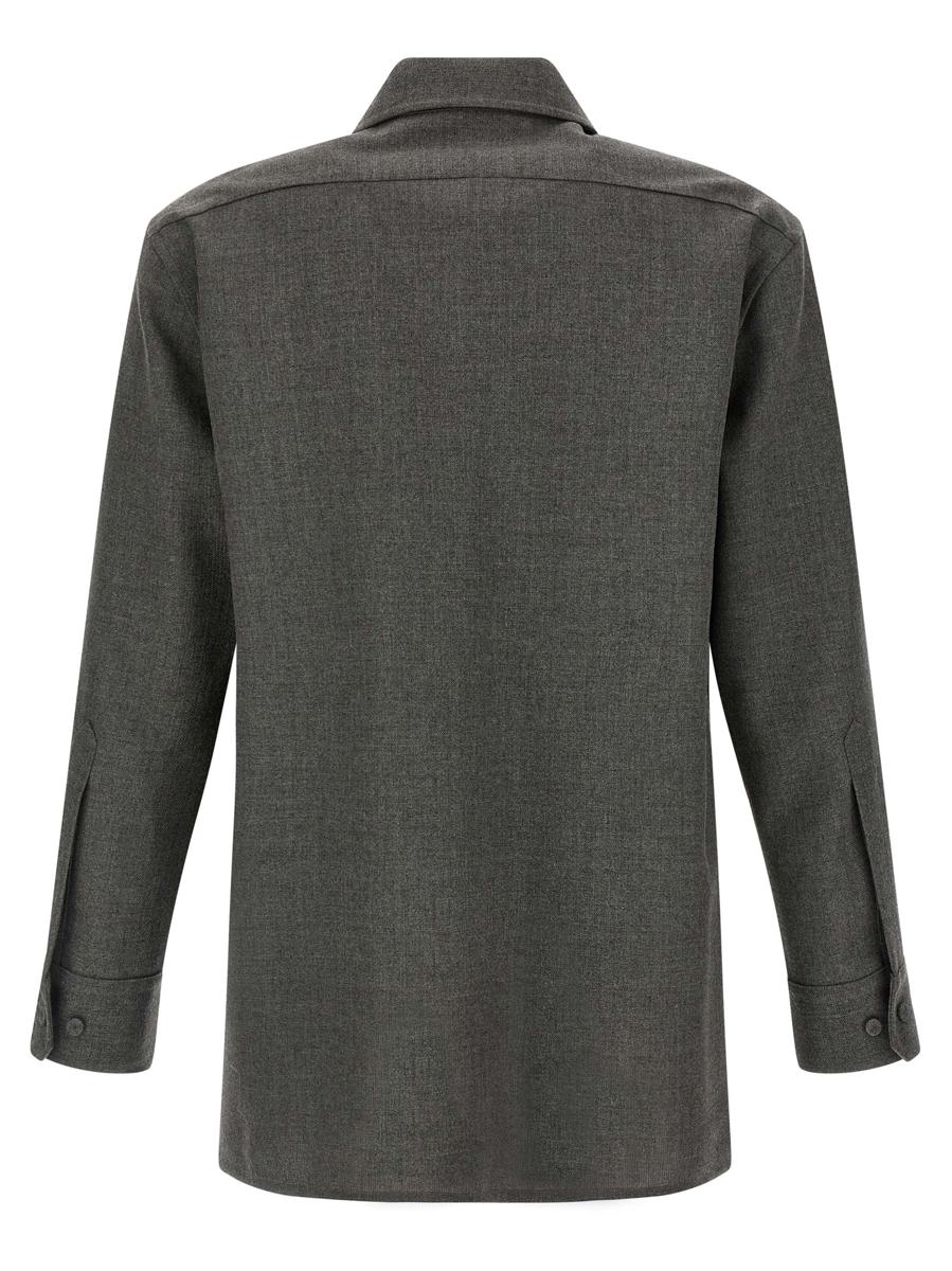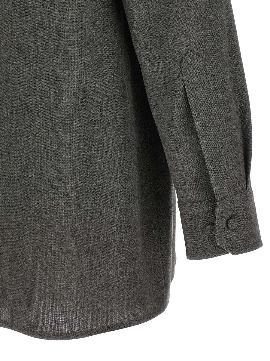 Wool canvas shirt, collar, front closure with covered buttons, front patch pockets, long sleeves, button cuffs